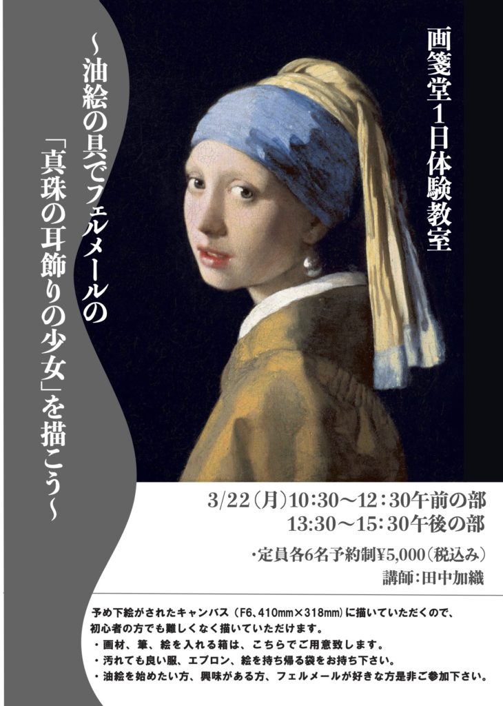 油絵を始めたい方、興味がある方、フェルメールが好きな方是非ご参加ください。