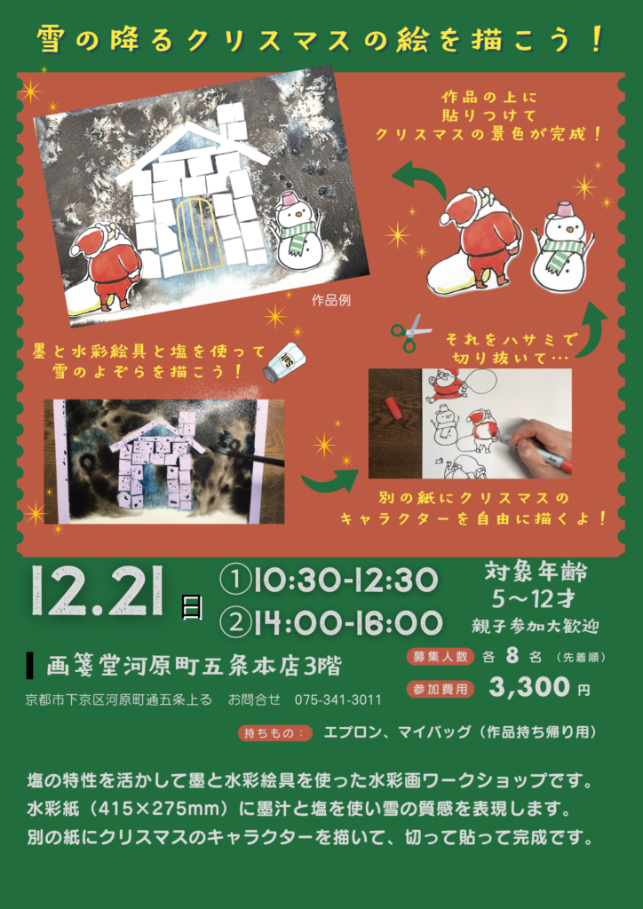12月21日(日)①10:30~12:30②14:00~16:00参加費:¥3,300 税込定員:各8名持ち物:エプロン、マイバッグ(作品を持つ帰る用)内容:塩の特性を活かした水彩画ワークショップです。415×275mmサイズの水彩紙に描きます。材料は全て用意するので、エプロンとマイバッグだけお持ちください。