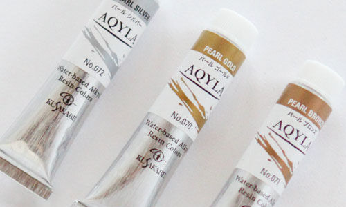 絵具において、金属色がどうやって作られているか、疑問に思われる方もいるかもしれません。アキーラではパールゴールド・パールシルバー・パールブロンズがそれにあたります。この三つを構成する顔料表示を見てみると、どれもPW20と書かれていますが、これはマイカ(雲母)のことです。金ならば雲母に黄色が、銀ならば雲母に白色が、銅ならば雲母に赤色が薄くコーティングされているため、いかにも金属らしく輝いて見えるということです。