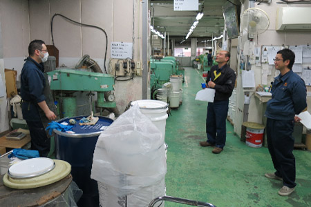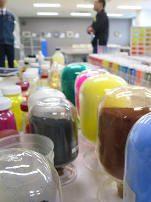 こちらの写真のようなサンプルが攪拌ミキサーの機械そばに置いてありました。作業途中の色を確認するためのパレットのようです。