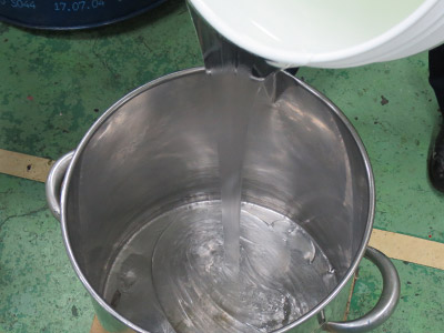 分散した絵具をもう一度ミキサーに戻し、水性アルキド樹脂を混ぜていきます。最初の段階で樹脂を混ぜないのは、水性アルキド樹脂をロールミルにかけるとエマルションが壊れてしまうからです。