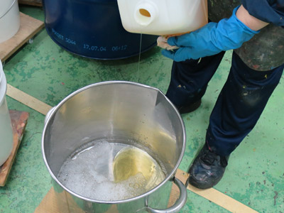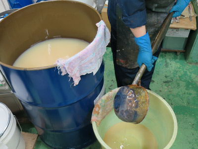 例えば生活の身近なアイテムで、水と油と卵が安定して混ざっているエマルション状態のものをイメージすると、実はマヨネーズがそれです。他にも牛乳・木工用ボンドなども、エマルション状態にある物質です。水性面も油性面も両方に定着させる。これがテンペラ絵具の大きな特徴です。