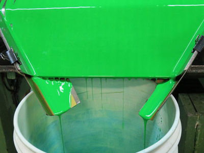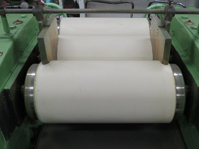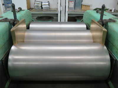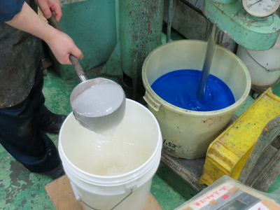 水と顔料を混ぜた液をロールミルに流し込み、ロールを通って顔料が分散されていきます。分散とは、顔料の粒子をほぐす作業のことを言います。