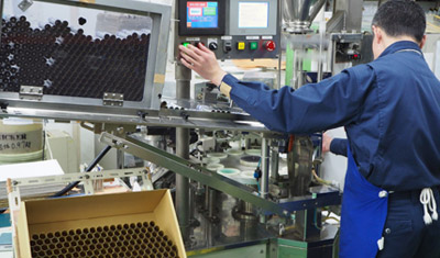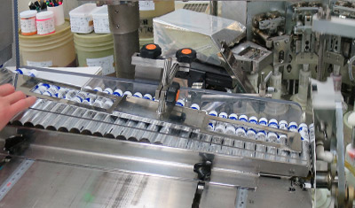 しかし印刷で作るとなると、ロット数が5,000〜10,000本と膨大なため、一回の発注にたくさんの本数を抱えなければなりません。共通したチューブのほうが、在庫管理がしやすいとのことです。こちらの動画がラベルを貼る機械。1本1本、丁寧に機械に通していきます。